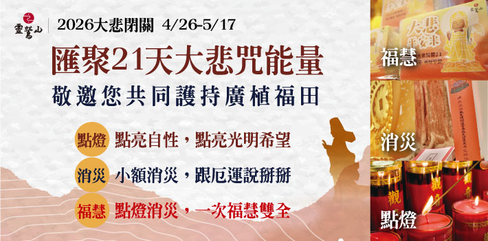 解密「共修」能量場! 靈鷲山大悲閉關15周年啟動 靈鷲山2026年大悲閉關邁入第15周年,將於4月26日啟建,今年以《給AI世代的一帖慈悲良方》開展系列講座,深入介紹大悲閉關的獨特之處,引導大眾認識21天的殊勝閉關,並了解如何透過共振共修的能量,讓個人在極短時間內放下緊繃的情緒,進入深層的穩定狀態。 2026-03-26 即時快訊 即時快訊 2026-03-26 解密「共修」能量場! 靈鷲山大悲閉關15周年啟動 靈鷲山2026年大悲閉關邁入第15周年,將於4月26日啟建,今年以《給AI世代的一帖慈悲良方》開展系列講座,深入介紹大悲閉關的獨特之處,引導大眾認識21天的殊勝閉關,並了解如何透過共振共修的能量,讓個人在極短時間內放下緊繃的情緒,進入深層的穩定狀態。