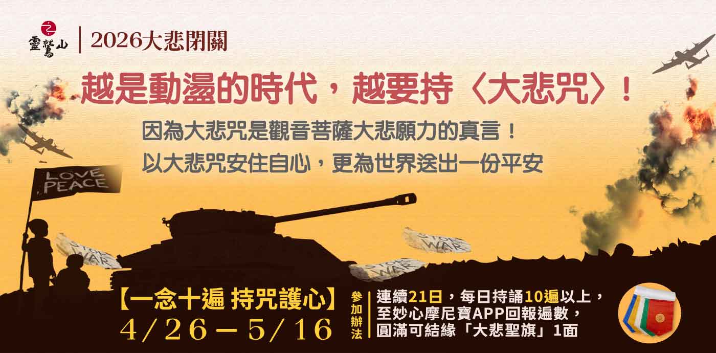 靈鷲山2026年大悲閉關邁入第15周年,將於4月26日啟建,今年以《給AI世代的一帖慈悲良方》開展系列講座,深入介紹大悲閉關的獨特之處,引導大眾認識21天的殊勝閉關,並了解如何透過共振共修的能量,讓個人在極短時間內放下緊繃的情緒,進入深層的穩定狀態。