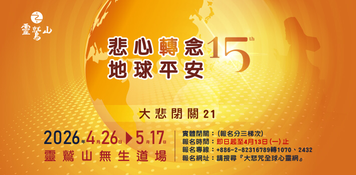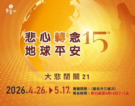 解密「共修」能量場! 靈鷲山大悲閉關15周年啟動 靈鷲山2026年大悲閉關邁入第15周年,將於4月26日啟建,今年以《給AI世代的一帖慈悲良方》開展系列講座,深入介紹大悲閉關的獨特之處,引導大眾認識21天的殊勝閉關,並了解如何透過共振共修的能量,讓個人在極短時間內放下緊繃的情緒,進入深層的穩定狀態。 2026-03-26 即時快訊 即時快訊 2026-03-26 解密「共修」能量場! 靈鷲山大悲閉關15周年啟動 靈鷲山2026年大悲閉關邁入第15周年,將於4月26日啟建,今年以《給AI世代的一帖慈悲良方》開展系列講座,深入介紹大悲閉關的獨特之處,引導大眾認識21天的殊勝閉關,並了解如何透過共振共修的能量,讓個人在極短時間內放下緊繃的情緒,進入深層的穩定狀態。