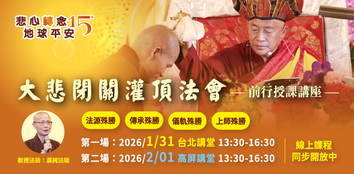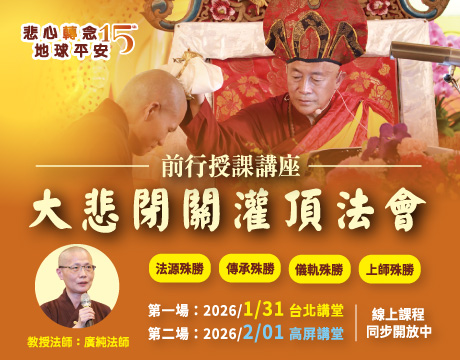 大悲閉關灌頂傳承法會 前行授課講座 2026年大悲閉關圓滿日將啟建三年一次的觀音傳承灌頂法會,讓修持大悲咒的行者們正式承接觀音法門的法脈傳承,將觀世音菩薩的慈悲願行無盡延續下去。 2026-01-09 活動動態 活動動態 2026-01-09 大悲閉關灌頂傳承法會 前行授課講座 2026年大悲閉關圓滿日將啟建三年一次的觀音傳承灌頂法會,讓修持大悲咒的行者們正式承接觀音法門的法脈傳承,將觀世音菩薩的慈悲願行無盡延續下去。