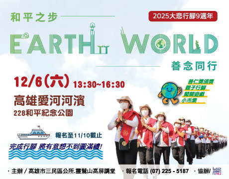 觀音慈愛在人間 高屏講堂12月6日大悲行腳/普仁獎同步登場 和平之步,善念同行!靈鷲山是觀音道場,為了廣傳觀世音菩薩的慈愛,高屏講堂將在高雄228和平公園操場舉辦第9屆大悲行腳活動 2025-11-06 活動動態 活動動態 2025-11-06 觀音慈愛在人間 高屏講堂12月6日大悲行腳/普仁獎同步登場 和平之步,善念同行!靈鷲山是觀音道場,為了廣傳觀世音菩薩的慈愛,高屏講堂將在高雄228和平公園操場舉辦第9屆大悲行腳活動